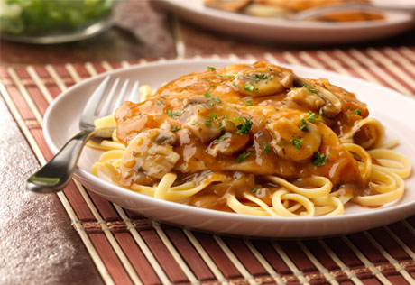 Coated boneless chicken breasts are sautéed and then simmered in a delectable sauce featuring sweet onion soup, mushrooms and minced onion. Serve it over your favorite pasta or mashed potatoes for an easy, delicious and hearty dish that the whole family will enjoy.
