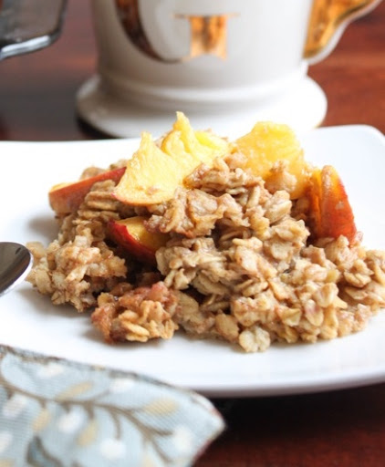 Place the peaches on top of the oat mixture and drizzle any leftover brown sugar and lemon mixture on top.