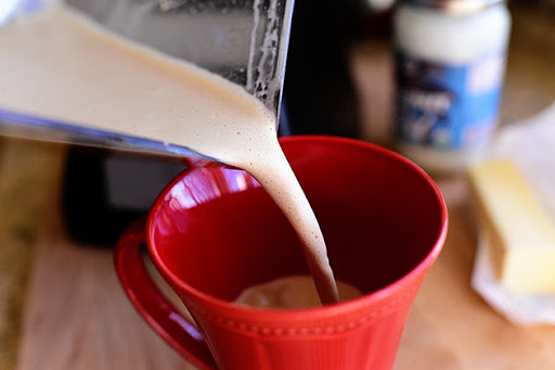 Place all three ingredients in a blender and blend until emulsified, about 10-15 seconds (it will look like very creamy coffee). Pour into a coffee cup and enjoy immediately! (Warm it for 15 seconds in the microwave after blending if you'd like it to be very hot; blending cools it down slightly.)