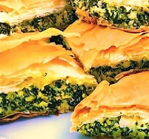COVER spinach with one phyllo sheet, brushing with butter; SPRINKLE buttered phyllo sheet with 2 tablespoons grated parmesan cheese; LAY another 2 sheets phyllo on top of cheese-sprinkled layer; BRUSH with butter (do not add cheese to the following two sheets); REPEAT with one more phyllo sheet.