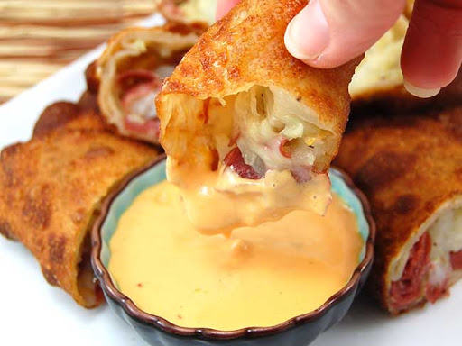 Add 6 slices of corned beef and then cabbage from the left to right side of the spring roll wrapper. You may have to adjust amounts, less or more, depending on the size of the wrapper or desired fullness. Fold left and right sides of wrapper over edges of filling. Roll wrapper from bottom. Repeat with remaining spring roll wrappers.