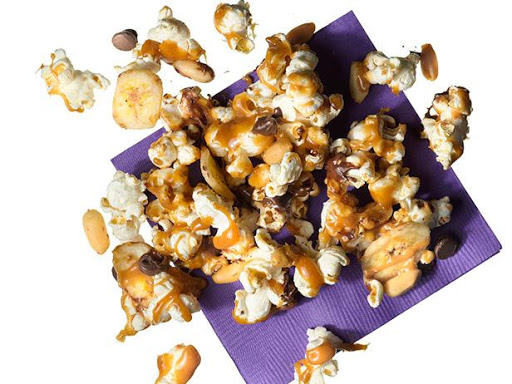 Heat honey and sugar over medium heat, stirring, until the sugar dissolves, about 5 minutes. Stir in peanut butter and vanilla extract and kosher salt until smooth; pour over hot popcorn and peanuts, banana chips, chocolate chips and thttp://www.keyingredient.com/post/?url=http%3A%2F%2Fwww.foodnetwork.com%2Frecipes%2Farticles%2F50-flavored-popcorn-recipes%2Fflavored-popcorn-ideas.html#oss. Spread on baking sheets and let cool.