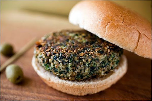 4. Return the pan to the heat and add the spinach, a handful at a time. Cook just until it wilts and remove from the heat. Transfer to a strainer and, with the back of a spoon, press out excess water. Add spinach to the food processor and process with the mushrooms and almonds until the ingredients are well blended. Scrape the mixture into a bowl, stir in the bulgur and egg (if using), and season to taste with salt and pepper. Form into patties. If there is time, cover and chill for 1 to 2 hours.