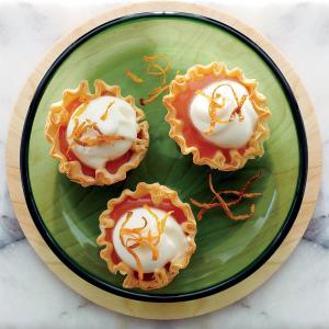 6. Spoon about 2 tsp curd into each phyllo cup; top each with about 2 tsp cream. Sprinkle with dried rind.