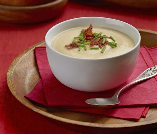 To serve, ladle the soup into bowls and garnish it with the remaining 1 cup of cheese and crumbled bacon and chives or parsley.