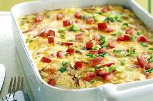 BEAT eggs and sour cream with whisk until well blended. Pour into greased 13x9-inch baking dish; top with bacon mixture and cheeses.
