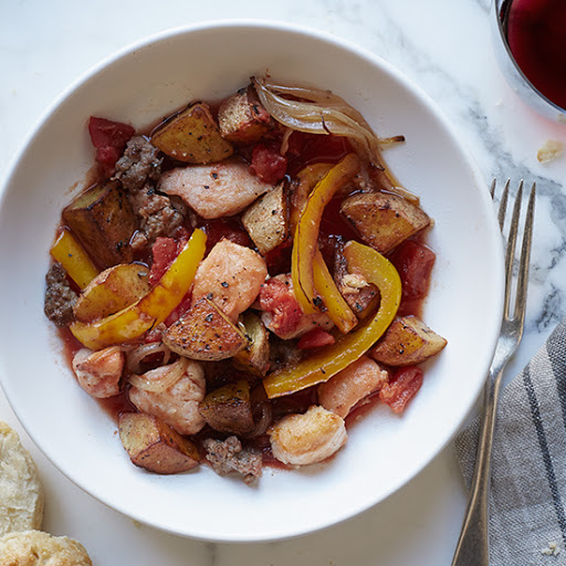 until tender and lightly browned, about 8 minutes. Add the chicken and sausage and cook until browned, about 5 minutes. Stir in the tomatoes, garlic, Worcestershire sauce, hot sauce and horseradish and cook until the sauce is thickened, about 5 minutes. Stir in the potatoes until warmed through. Season