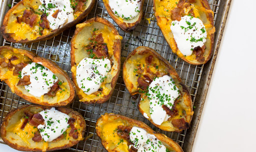 Divide cheese and bacon among potatoes and broil until cheese is melted, about 2 minutes. Serve topped with sour cream, chives, and black pepper.