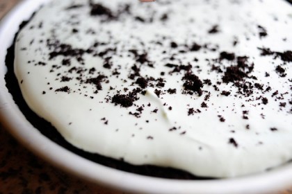 Throw the cookies and melted butter into a food processor and pulverize (or, if you have some aggressions or energy to expend, you can crush them in a large Ziploc bag.) Pour into a pie pan and press into the bottom and up the sides of the pan. Set aside.