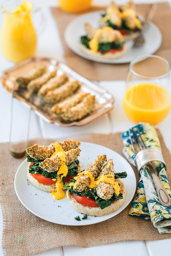 Afraid you’ll miss the feeling of being oh-so-fancy when you order eggs Florentine at brunch? No worries—you can feel fancy all the time with these super-easy vegan Florentines you can make at home! Avocado replaces the egg, and yes, you could serve it with some fresh, cold avocado and be totally content, but it’s even better to coat the avocado slices in panko bread crumbs and Pecan Parmesan and bake them briefly so the coating gets nice and crispy. Then just add English muffins, kale, and a smoked paprika hollandaise sauce and you can go on being your fancy self.