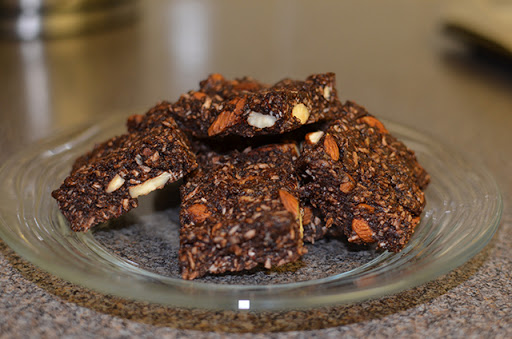 2. Add coconut, cocoa or carob powder, coconut sugar, cinnamon, salt, and chilli flakes to your almonds and combine.
