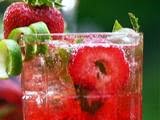 Add strawberries and limes into a large mortar or bowl. Crush together to extract juices. Add mint and crush to incorporate the flavors. Add strawberry syrup and pour into a pitcher. Add Champagne and stir. Serve in ice filled glasses and garnish with strawberry slices.