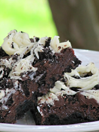 Pour chocolate mixture over the Oreo crust. Spread evenly. Sprinkle the chocolate filling with 3/4 cup of chocolate chips, and the remaining 8 Oreos, that you have broken into small pieces and the 1/2 cup of 60% chips.