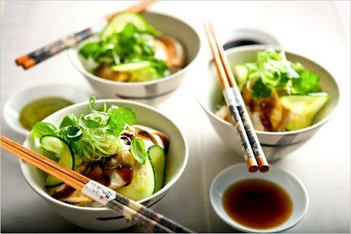 5. When chicken is done, transfer to a cutting board and slice. Remove garlic and pepper from broth and discard, if you like. To serve, heap rice in 4 shallow bowls and top with chicken slices. Spoon several tablespoons broth over chicken and rice, then drizzle with sweet soy sauce and sesame oil. Sprinkle on the herbs, scallions and cucumber. Serve garlic-chili-ginger sauce on the side; have additional sesame oil and sweet soy sauce on table for more drizzling.