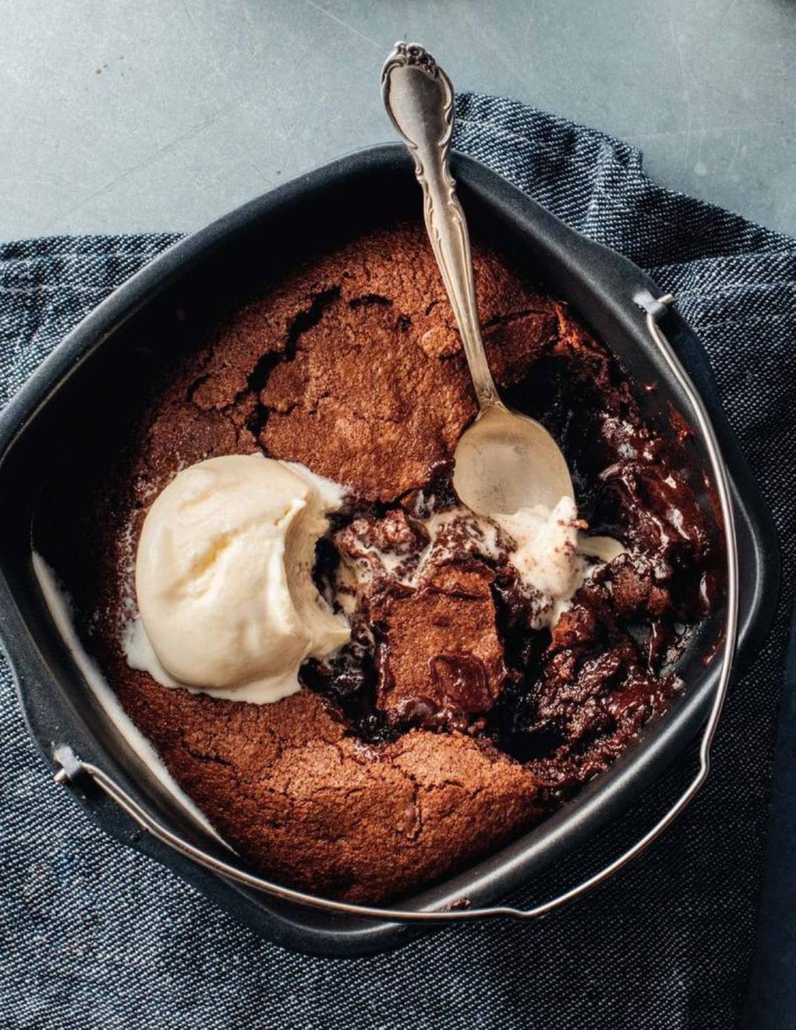 With the air fryer, they’re intentionally left soft in the middle, so you can spoon the brownie “pudding” straight into a bowl while hot and molten and get straight to your happy place. An important tip: If you don’t have an insert with an easy-lift handle, serve the spoonable brownies directly from their pan in the basket since trying to lift the pan out by tilting it while the brownie is still hot could cause the liquidy center to spill out all over your air fryer. Trust me on this.