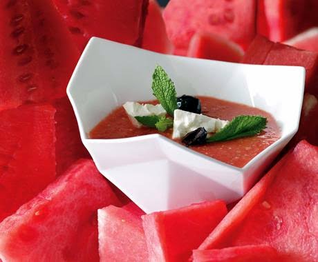 TOMATO-WATERMELON SOUP w/FETA & OLIVES