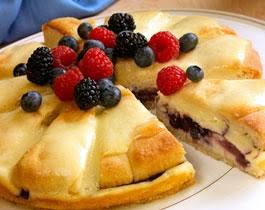 Bake 30 minutes (cover with aluminum foil if cake begins to brown). Cool 10 minutes. Release cake from pan and cool 20 to 30 minutes. Garnish with berries, slice and serve.
