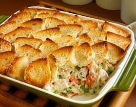 Fold in chicken, carrots, peas, beans and mushrooms into sauce. Pour all into prepared baking dish.
