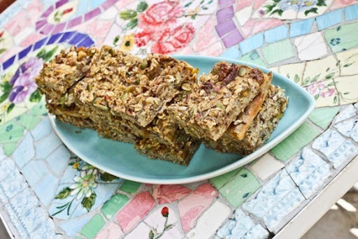 Makes 9 servings . Each bar is appx. 170 calories, 3 grams fiber and 5 grams protein. [Cut into 12 squares reduces calories to about 125 calories per square]