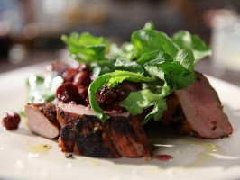Dress the arugula lightly in the olive oil. Slice the pork and arrange on a plate. Remove 1/2 cup of the mustard fruit from the liquid with a slotted spoon and spoon on top of the pork. Top with the arugula.