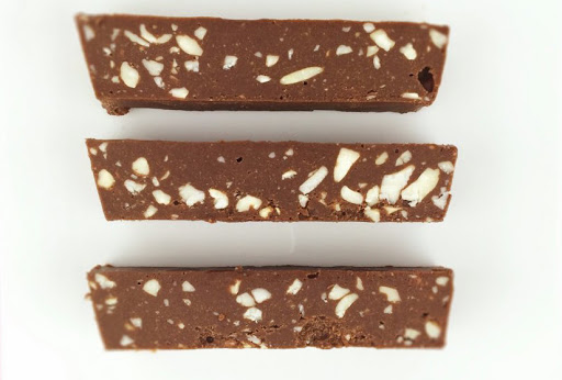 Place all ingredients except for the cashews into a medium sized bowl and mix until well combined and looking deliciously chocolatey. Stir in the cashews. Pour the mixture into a silicon loaf tin. Place in the fridge to set.