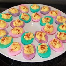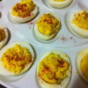 Spoon 1 heaping Tbsp of yolk mixture into each reserved egg white half. Refrigerate covered, to blend flavors. Sprinkle with paprika just before serving.