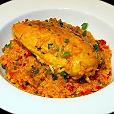 Sprinkle both sides of chicken with garlic, salt and pepper. Spread rice in bottom of rectangular baking pan and arrange chicken breasts on top of rice.