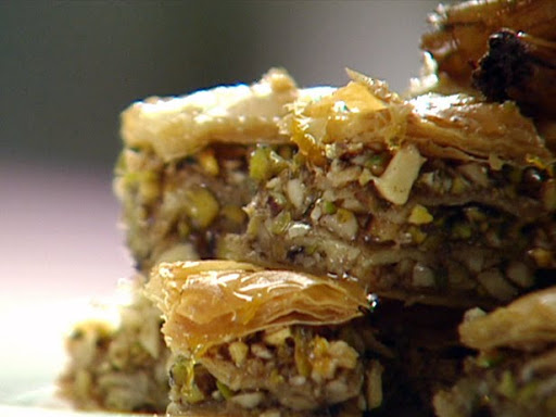 Alternate the 6 sheets of filo-butter layer and a third of the nut mixture twice more, and then top with 6 more layers of filo pastry. Butter the top of the last layer, and trim off any overlapping pastry with a sharp knife to create a neat edge. Cut into small diamonds, about 1 1/2 to 2-inch squares, making sure the knife goes all the way through the bottom layer.