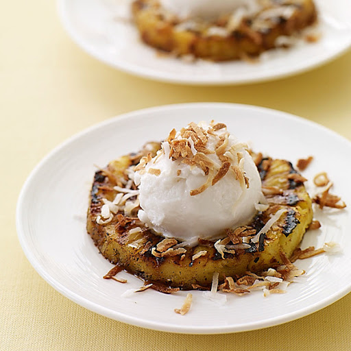 To serve, place 1 pineapple slice on each of 6 plates; top each with 1/4 cup sorbet and sprinkle each with 1 tablespoon coconut. Serve immediately.