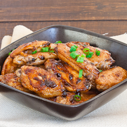 Place wings on baking sheet and bake for 25 to 30 minutes or until chicken is cooked through. Take remaining marinade and cook it in a small sauce pan over medium heat. It will start to reduce and thicken in about 5 to 10 minutes. Once it has thickened into a thick sauce remove from heat. Once wings are done, brush wings with sauce and garnish with chives or green onions if preferred.