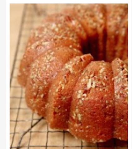 In the bowl of an electric mixer fitted with the paddle attachment, mix together brown sugar, butter, and eggs until very light and fluffy. Add sweet potato and vanilla; beat to combine. Add flour, milk, bourbon, baking powder, pie spice, and salt; mix until just incorporated. Lightly spray a 10 or 12 cup Bundt pan with cooking spray. Sprinkle bottom and up sides of the pan with pecans. Pour in cake batter.
