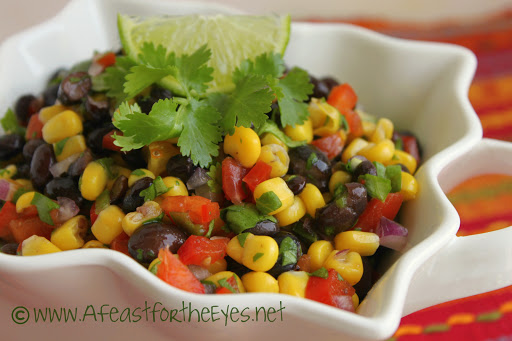 My favorite time to make this colorful salad is during the summer, when corn is freshly picked. When I take this to a pot luck, it's gone in no time at all. For a healthy vegetarian snack, I make tortillas wraps with a layer of lime sour cream and brown rice. This recipe is very versatile, as I've even added it to my beef enchilada filling.