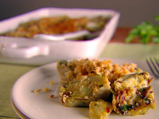 Baked artichoke hearts topped with bread crumbs and Parmesan cheese. A perfect side dish with roasted chicken.