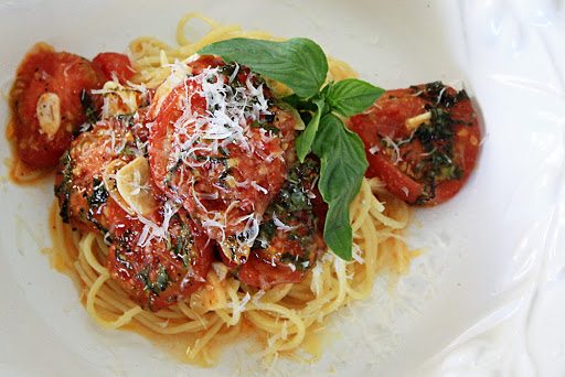 7. Spoon over pasta and serve with Parmesan cheese and fresh basil.