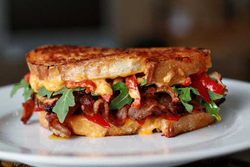 Feel like upping your grilled cheese game? Look no farther. This sandwich has it all: juicy grilled pork tenderloin, mascarpone and cheddar cheese, peppadew peppers and bacon. I mean ... come ON!