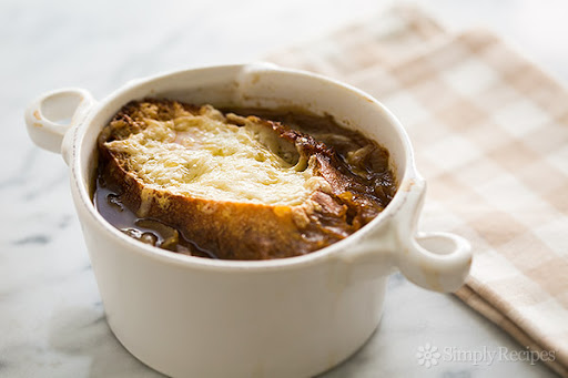 Alternatively, you can use individual oven-proof bowls or one large casserole dish. Ladle the soup into the bowls or casserole dish. Cover with the toast and sprinkle with cheese. Put into the broiler for 10 minutes at 350 degrees F, or until the cheese bubbles and is slightly browned.