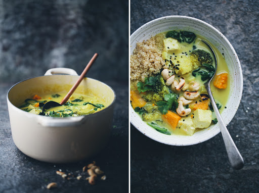 We start out with a base of onion, garlic, ginger (heaps!) and turmeric, then add whatever vegetables we have within reach, fill up with coconut milk and add some tofu. And right when it’s done cooking, we always add fresh spinach that we quickly let wilt down without loosing its sturdiness. The result is a sweet and creamy dish with lots of vegetables and a punch of ginger and garlic. It’s a very likeable dish and easy to adapt to whatever flavors you prefer. Chili would be a good addition if you like it spicy and are not cooking for kids. We always make huge batches of this so we have lunch or dinner sorted for another day. It keeps well in the fridge and the flavours will develop even further.