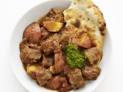 Toss the beef and potatoes with the curry powder, 1 teaspoon cumin, 1 tablespoon ginger, the garlic, 1 teaspoon salt and a few grinds of pepper in a 6-quart slow cooker. Crumble 1/2 slice of naan into small pieces over the beef and potatoes, then pour in the tomatoes. Cover and cook on low, 7 hours.