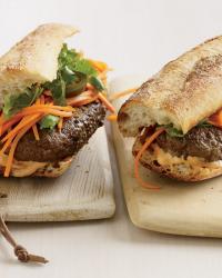 Meanwhile, spread the butter on the cut sides of the baguette. Set the bread cut side up on a baking sheet and bake for about 5 minutes, until lightly toasted. Spread the spiked mayonnaise on the bread and top each baguette section with a burger patty, pickled shredded carrots, pickled jalapeño slices and cilantro sprigs. Close the sandwiches and serve hot.
