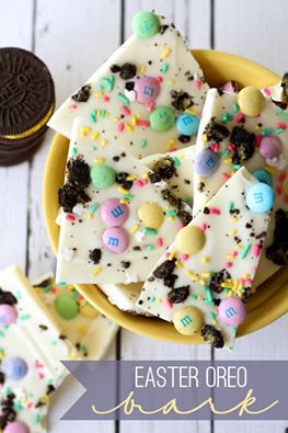Festive Easter bark is made with candy coating, Oreos, Spring-colored M&Ms, Spring-colored sprinkles or decorations. This pastel recipe is perfect for any Springtime celebration or Easter party. Package this bark up in festive tins, boxes, or bags and gift to some of your favorite people and loved ones to spread the Springtime cheer.
