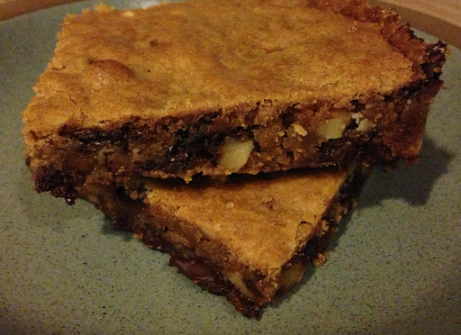 Preheat oven to 350. Mix brown sugar with cooled butter. Add eggs and vanilla, then dry ingredients. Fold in chocolate chips & walnuts. Bake for about 25 minutes until a toothpick comes out clean.
