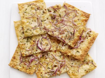 Mix 1 cup grated Gruyere, 3 tablespoons softened butter, 2 teaspoons chopped rosemary or thyme, and a pinch of red pepper flakes. Spread on 2 pieces lavash (or other flatbread); top with 1/2 cup thinly sliced red onion. Bake at 425 degrees F on a parchment-lined baking sheet until golden and crisp, 10 minutes. Season with salt; cut into pieces.