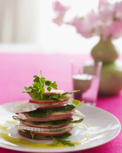 2. Place apple slices, salad and chévre in layers on 4 plates.