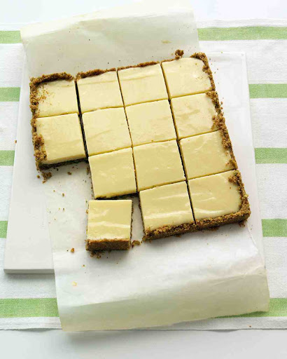 4. Bake until set, about 15 minutes. Cool in pan on rack; then chill at least 1 hour before serving. Using parchment paper overhang, lift out of pan, and transfer to a cutting board. With a serrated knife, cut into 16 squares, wiping knife with a damp kitchen towel between each cut.