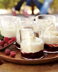 In another large stainless steel bowl, whip the cream to form firm peaks. Fold the whipped cream into the chilled zabaglione. Spoon the cherries into rocks glasses or bowls. Top with the zabaglione, garnish with the raspberries and serve.