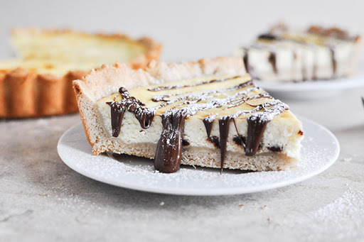 Bake at 350ºF for around 25-35 minutes, or until your crust has slightly browned and the filling has puffed a bit. Serve cold or at room temp sprinkled with powdered sugar or drizzled with chocolate.