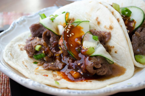 Prepare bulgogi and set aside. Prepare tortillas by wrapping them in wet paper towel and microwaving for 20-25 seconds.
