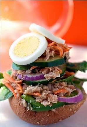 2. Combine all of the salad ingredients except the hard-cooked egg in a bowl, and toss with the dressing until thoroughly coated. Pile half of this mixture onto the bottom half of the hamburger bun. Push it down, and arrange the slices of hard-cooked egg on top. Season if you wish with salt and pepper, then pile the remaining salad on top of the eggs. It will look like a lot, but it will compress. Cover with the top bun, press down and wrap tightly in plastic. Allow to sit for 10 to 15 minutes, or for several hours in the refrigerator, before cutting in half. Wrap the half you don’t eat tightly, and refrigerate.