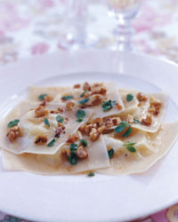 Add the ravioli to the simmering water and cook until just tender, about 2 minutes. Remove from the heat. With a slotted spoon, carefully transfer the ravioli to a large platter and blot dry with paper towels. Reheat the butter, letting it boil over moderately high heat until richly browned. Add the marjoram leaves and let wilt, about 5 seconds. Pour the browned butter over the ravioli, sprinkle with the toasted walnuts and serve right away.