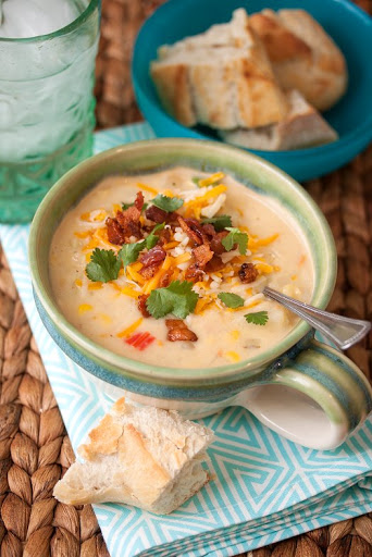 To serve, ladle chowder into bowl. Top with cheese, bacon, and fresh cilantro.